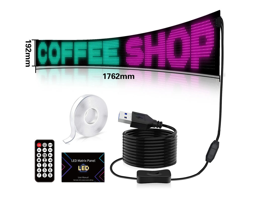 আকার: 192*1762 মিমি বৈশিষ্ট্য: LED ম্যাট্রিক্স প্যানেলঃ নমনীয় স্ক্রিন স্ক্রোলিং বার্তা বিজ্ঞাপন প্রদর্শন